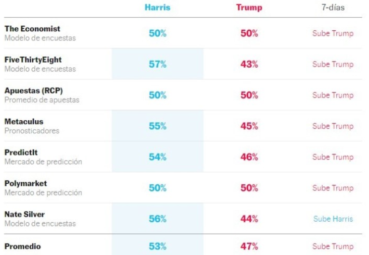 En la última semana, las probabilidades de que Donald Trump gane las elecciones de noviembre aumentaron levemente, pasando del 45% al 47%. Por su parte, las encuestas de The Economist, Polymarket y Apuestas (RCP) sugieren un empate técnico, con un 50% posibilidades para ambos candidatos.