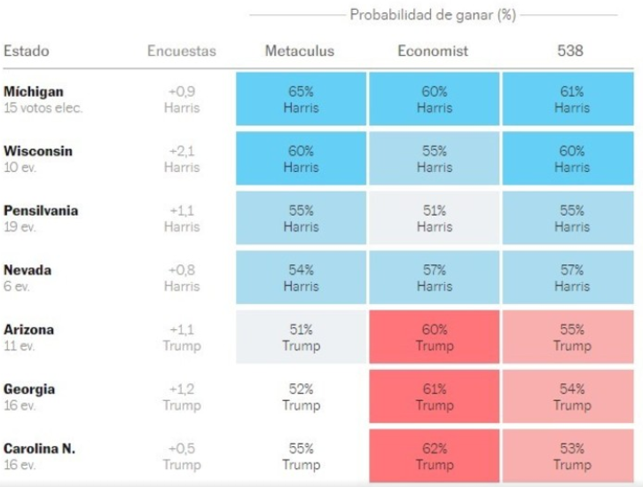 Sin embargo, mientras que la mayoría de las proyecciones citadas indican que las probabilidades de que Trump gane están subiendo, la encuesta de Nate Silver revela que Harris incrementó su probabilidad de ganar.En términos de votos electorales, Harris cuenta con 226 votos seguros o probables, casi la misma cantidad que Trump, que tiene 219. Los 93 votos restantes pertenecen a los estados clave, como Michigan, Wisconsin, Pensilvania, Nevada, Arizona, Georgia y Carolina del Norte.